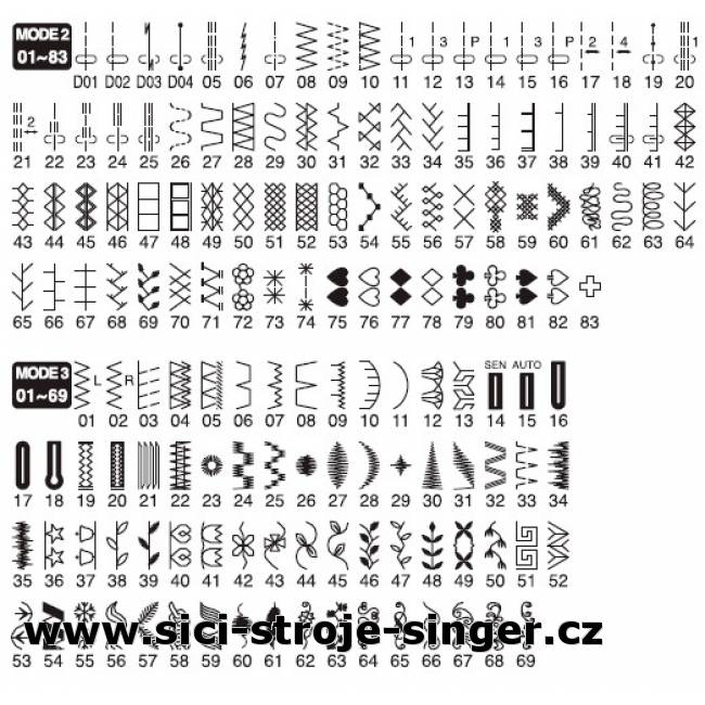 Celkem 163 šicích programů: základní, elastické (strečové), overlockové a plastické vyšívací, ozdobné